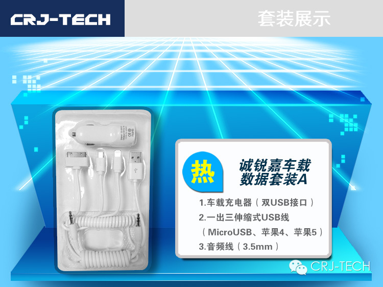 诚锐嘉新品来袭! 诚锐嘉车载三件套,车载充电器+数据线+AUX音频线,满足车用各种充电!